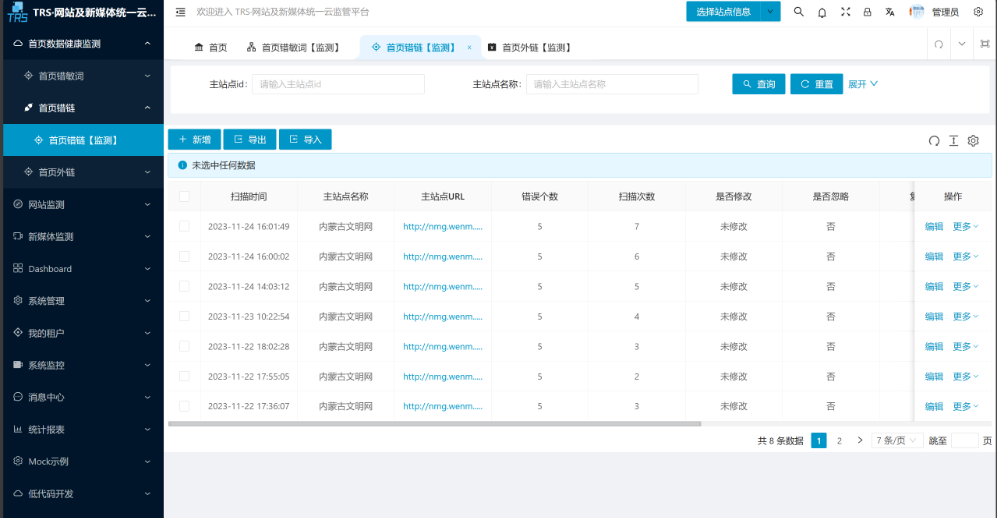 (7)首页信息:每天扫描首页页面,对外链错链以及错敏慈进行分析,报告,历史记录以及预警等功能,首页每天进行复查。